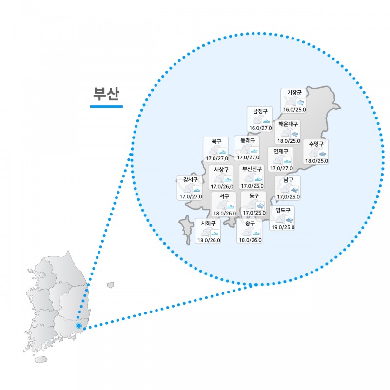오늘 13일 날씨 부산 지역 날씨 흐리고 구름많아 최저 18 20도 최고 중구 사상 25도 해운대 24도